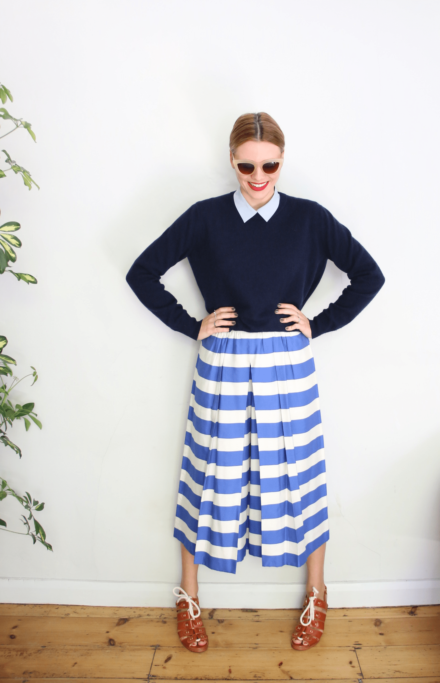 E uma das peças que brilhou nesses dias por lá foi uma pantalona listrada, tão larga que acaba tendo cara de saia. Basta dar uma olhadinha nas fotos da viagem ali no Insta pra ver como as listras azuis formaram o par perfeito com os mosaicos típicos da cidade.